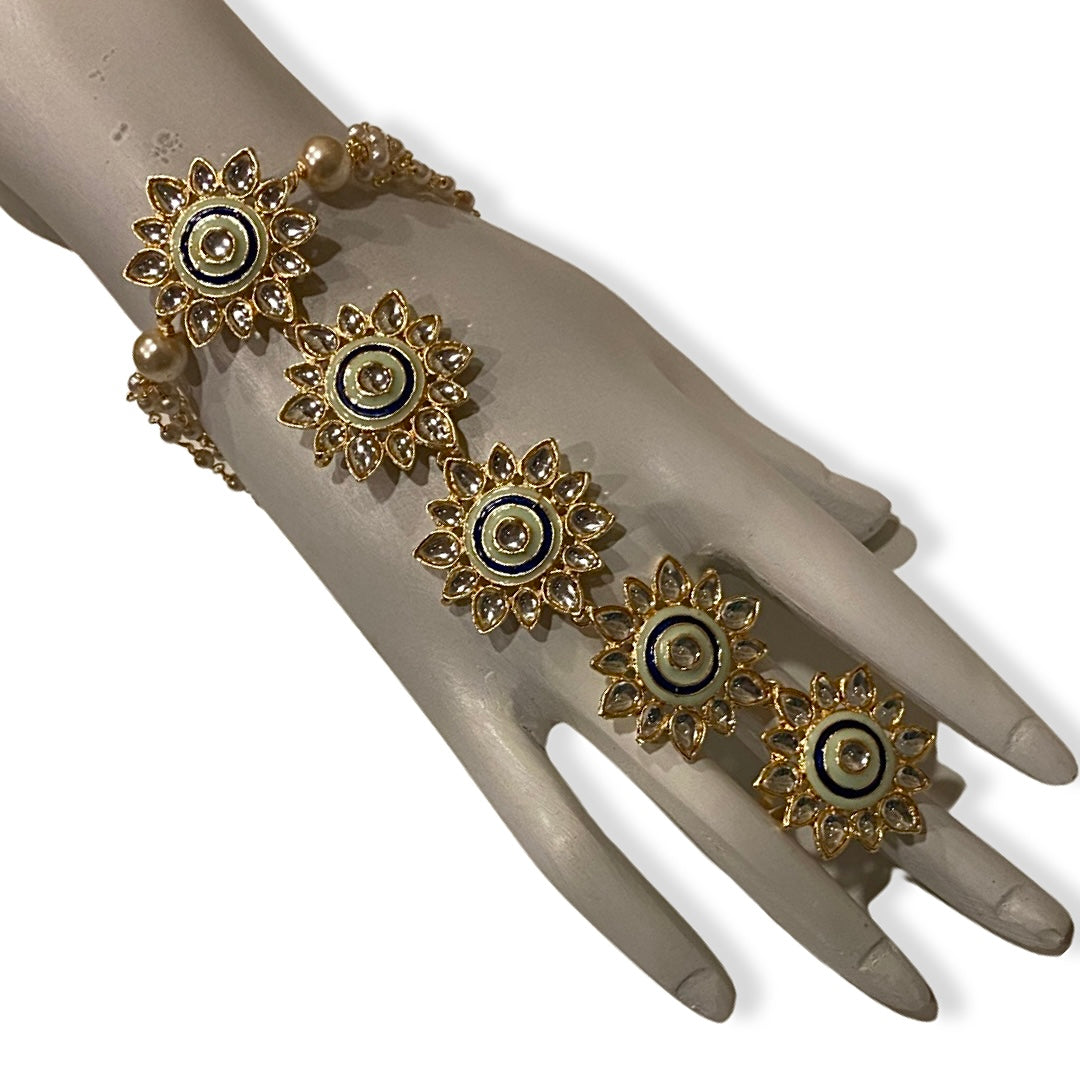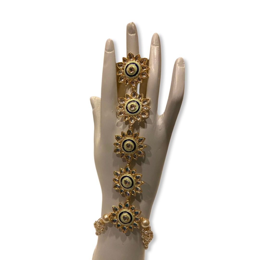 A gold plated, kundan stone & enamel Haath Pan.